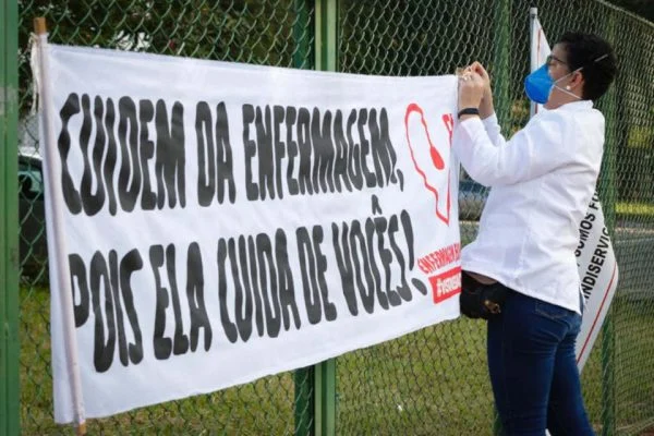Os profissionais carregavam faixas criticando a suspensão do piso e o ministro Barroso, assim como também o presidente Jair Bolsonaro pelo veto ao reajuste.
