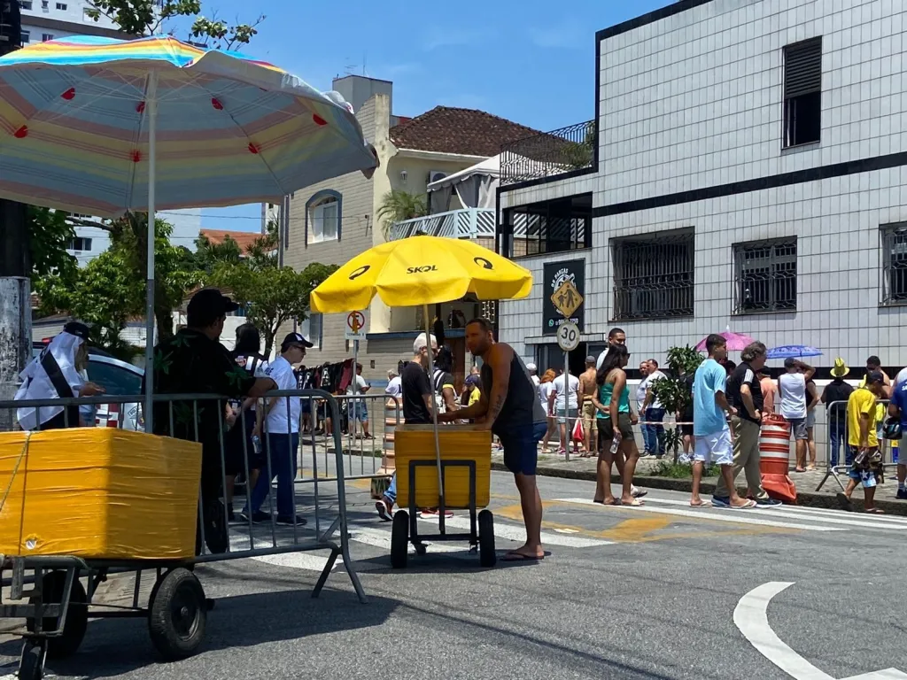 Por volta das 13h30 desta segunda-feira (2), uma longa fila de fãs aguarda do lado de fora da Vila Belmiro, em Santos, para prestar suas últimas homenagens ao Rei do Futebol, Pelé.