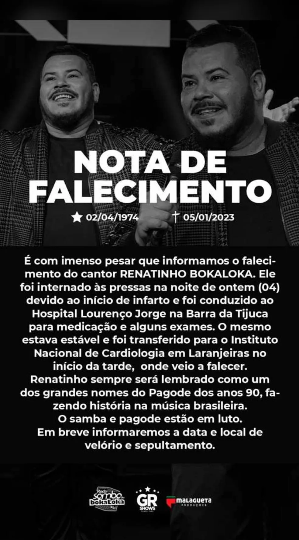 "Renatinho sempre será lembrado como um dos grandes nomes do Pagode dos anos 90, fazendo história na música brasileira", diz a nota de falecimento postada nas redes do empresário.